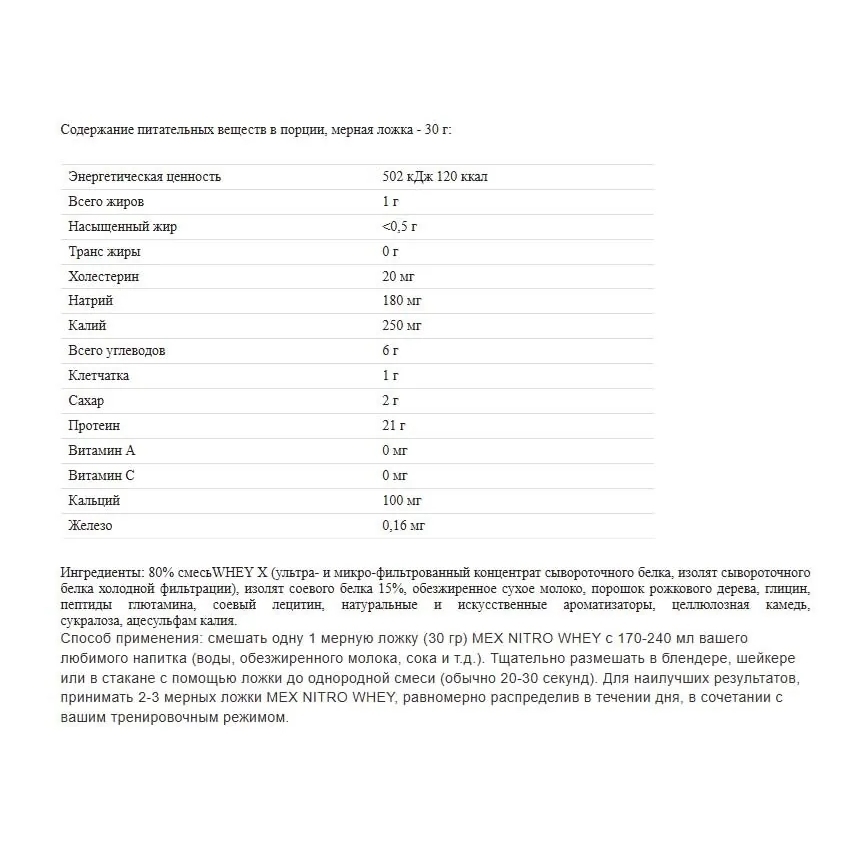 Применение:смешайте одну (1) мерную ложку (30 г) MEX NITRO WHEY с 6-8 унциями (около 220 мл) вашего любимого напитка (вода, молоко, сок и т. Д.). Взбить в блендере, взболтать в шейкере или размешать ложкой в стакане до однородной массы (обычно 20-30 с).