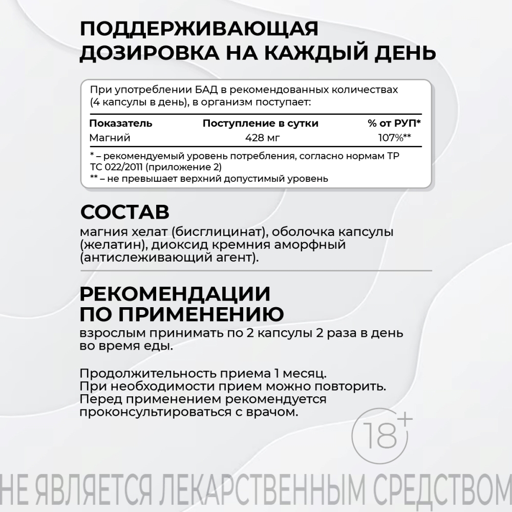 Биодоступная форма магния идеальна для взрослого человека. Магний играет ключевую роль в работе нервной системы. В комплексе с витаминами группы В он становится мощным инструментом для борьбы со стрессом. Продукт рекомендуется в качестве успокоительного от стресса, когда нужно восстановить спокойствие и стабильность в эмоциональном фоне.